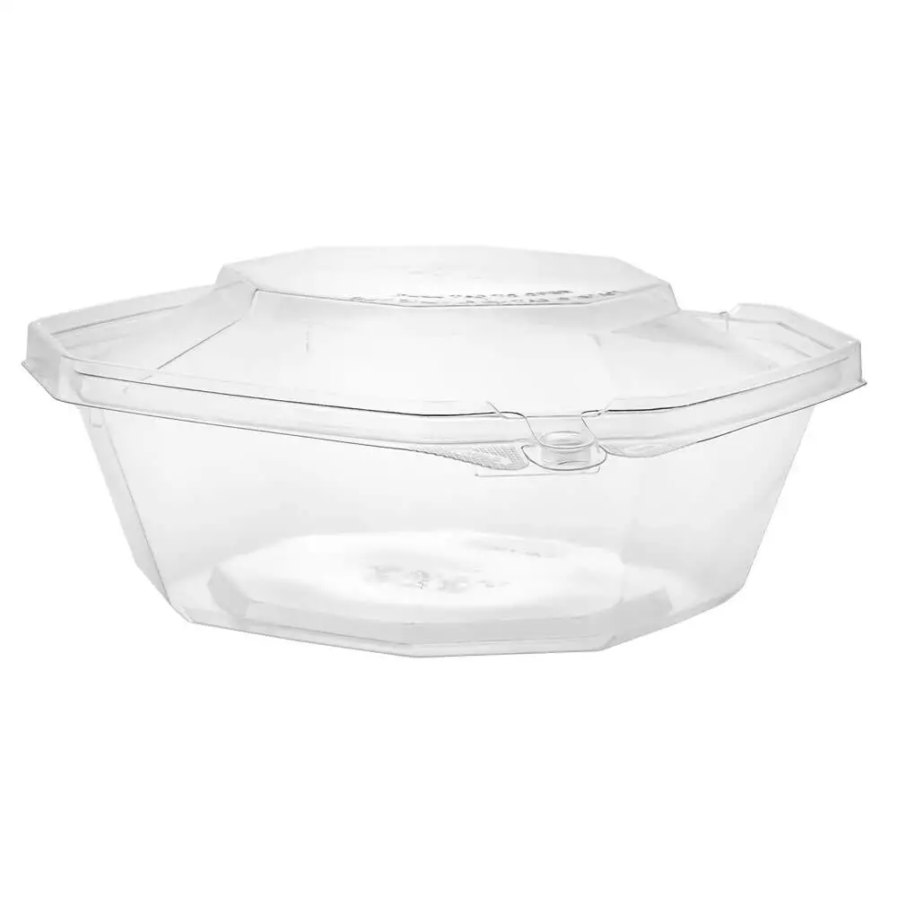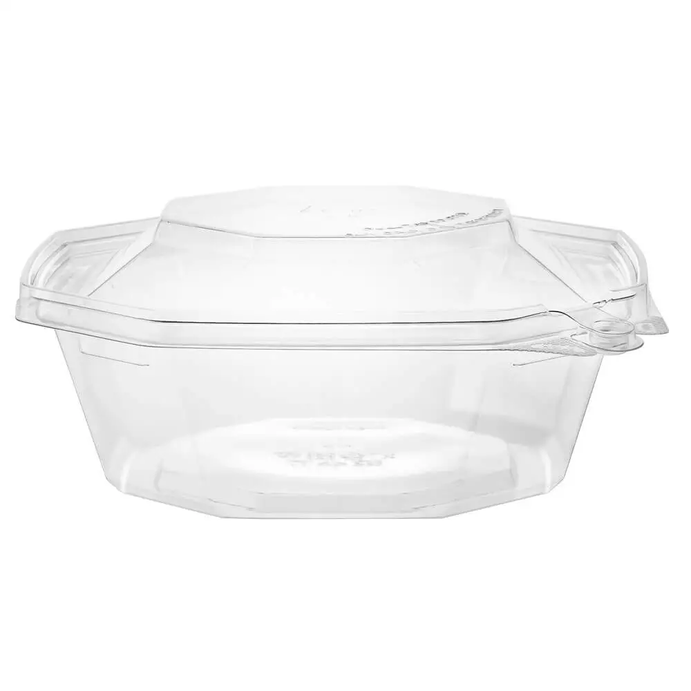 PCR Clear RPET octagonal shaped tamper evident container with no tear off strip. This uses our patented anti tamper design. Edges and high are all structurally reinforced for a sturdier product that closes securely. Material saving minimal stacking design to save space and cost during transportation and storage.