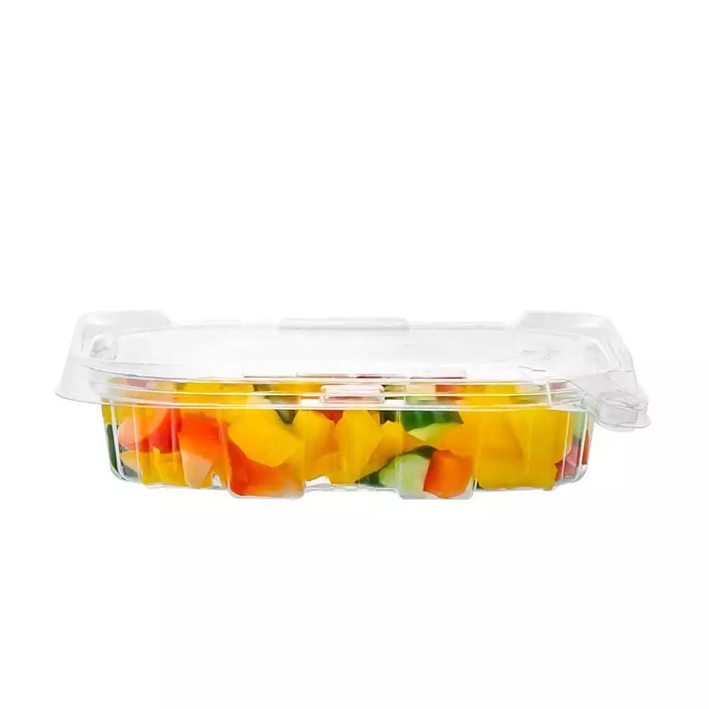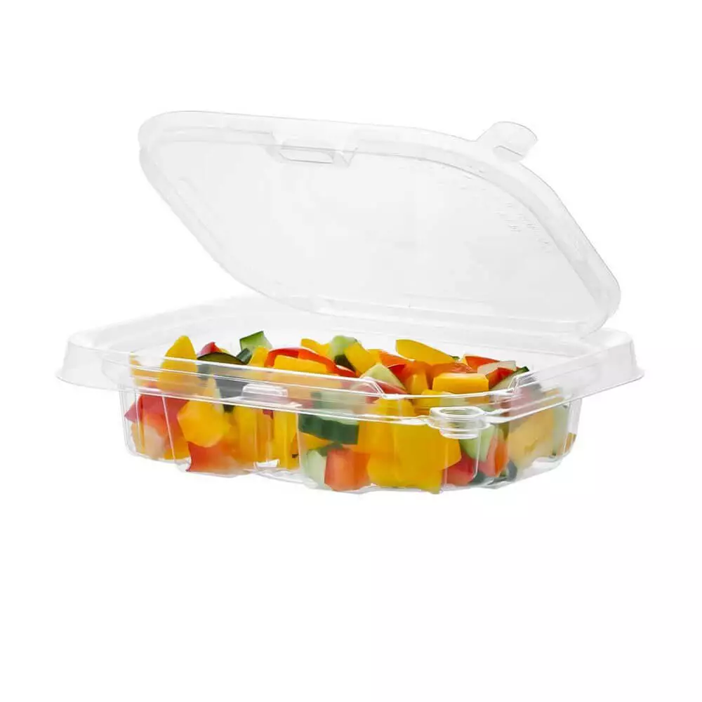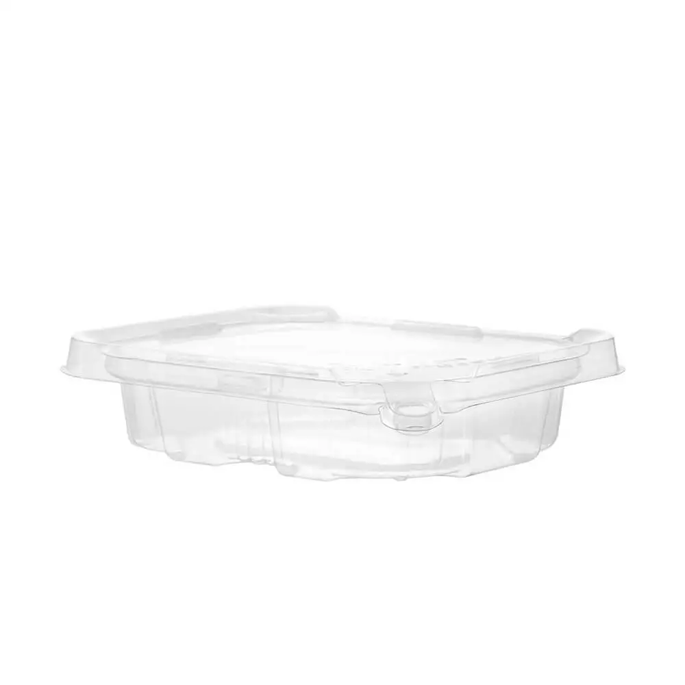 PCR Clear RPET Rectangular tamper evident container with no tear off strip. This uses our patented anti tamper design. Easy to seal and uses a special minimal stacking design for space saving in transportation and storage. Features excellent structural strength with minimal material usage.